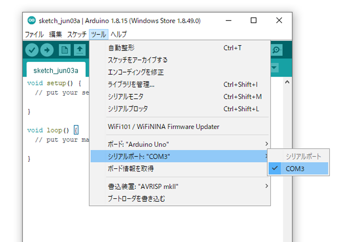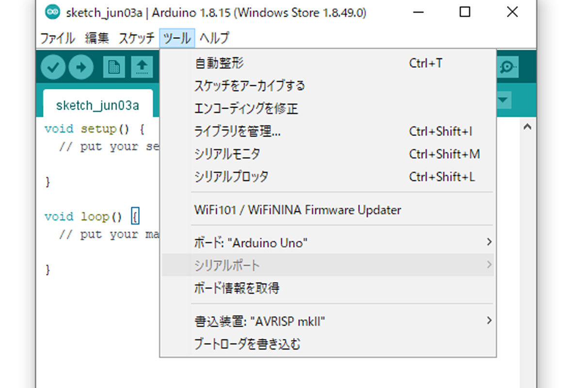 マイコンボードに書き込みボタンを押すと、「シリアルポートが選択されていません」とエラーが表示される。