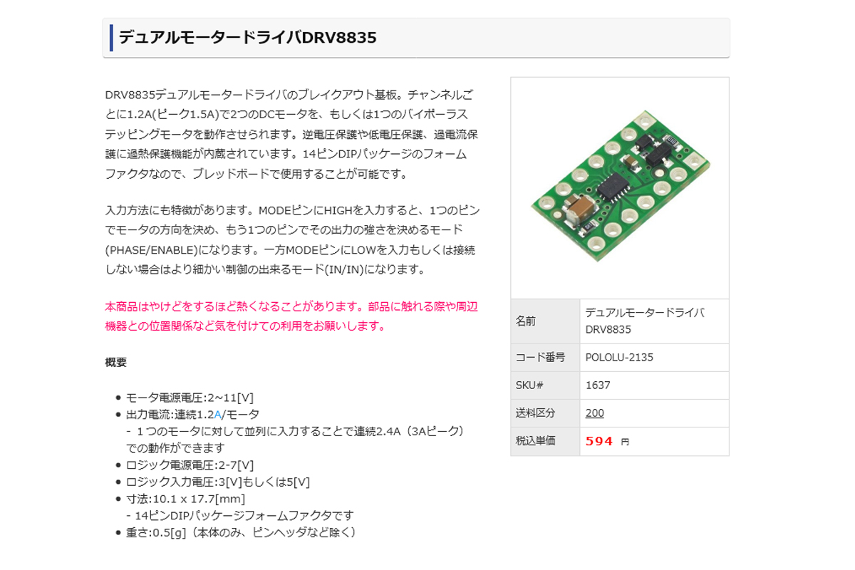- モータードライバー:DRV8835(Pololu社製)