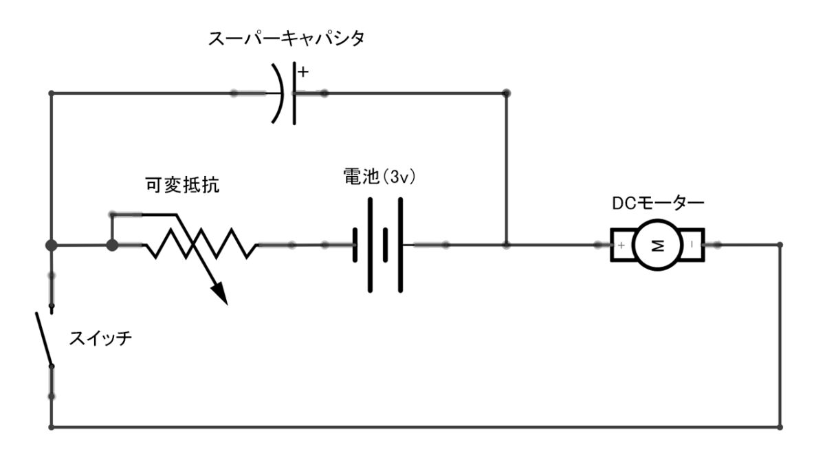 スーパーキャパシタとDCモーターと可変抵抗を接続