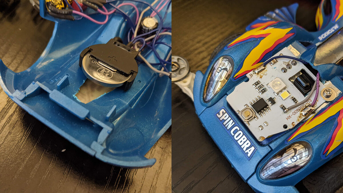 最初は、ボタン電池を使わず、ミニ四駆本体の乾電池だけで回路全ての電源を賄うつもりでした。