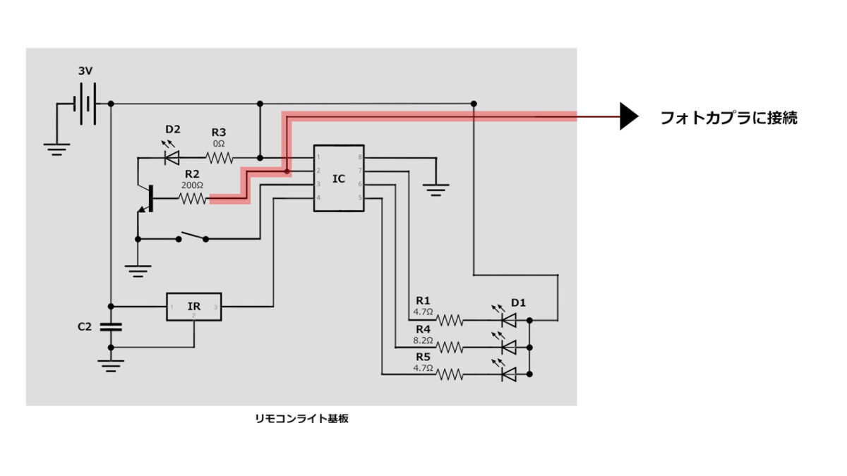 フォトカプラを使えば、リモコンライトの小さい電流信号を起点にして、乾電池から電源から大きい電流を引っ張ってくることができます。