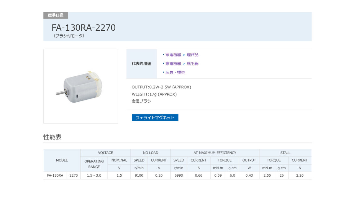 なお、ミニ四駆のノーマルモーター(マブチ FA-130)のスペックを見ると、対応電圧は1.5V〜3.0Vとなっています。