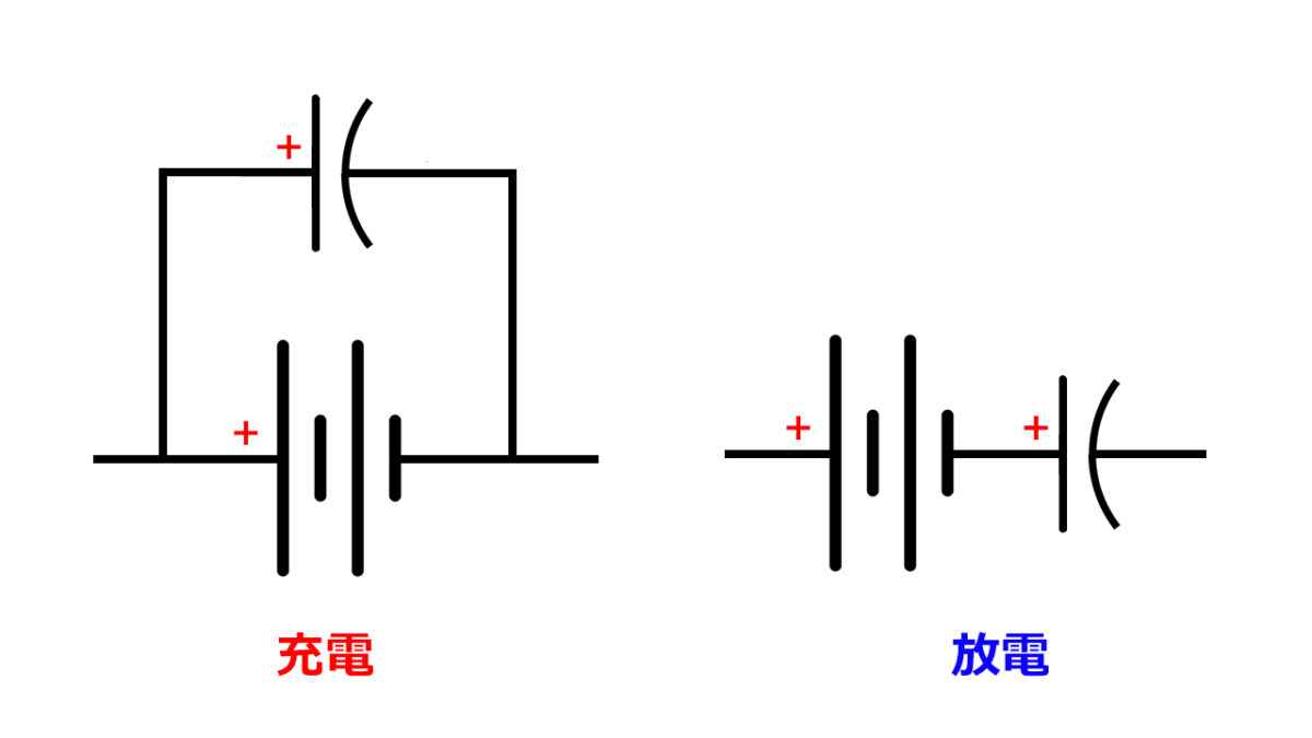 充電モードでは、電池とスーパーキャパシタの極性を合わせて接続する回路。