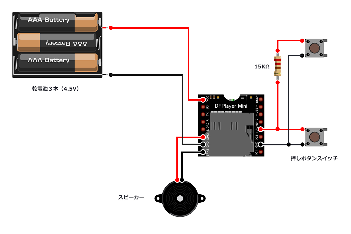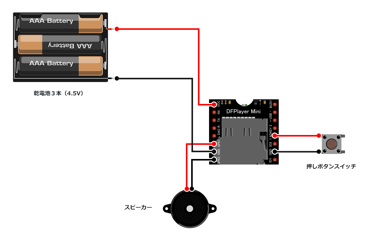 なお、音が鳴っている間はDFPlayerに搭載された赤いLEDが点灯します。