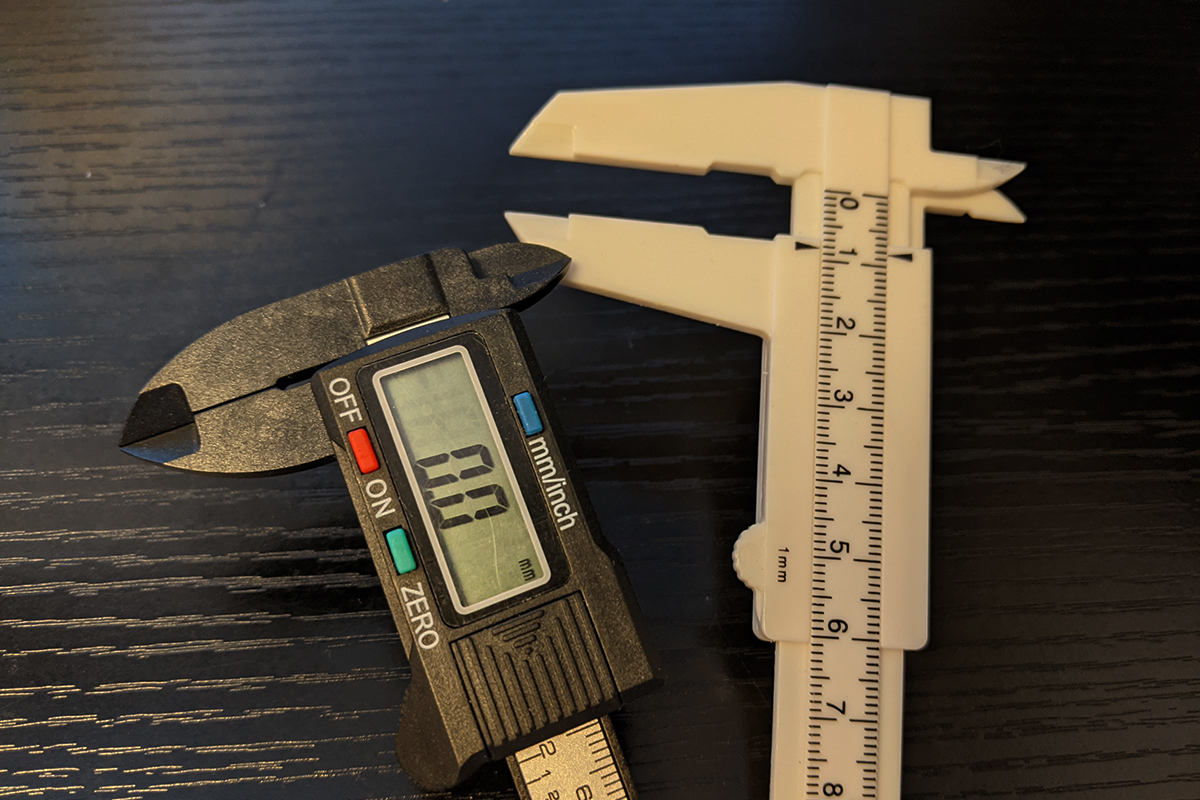 10,000円くらいの日本製ノギスだと「0.01mm」単位まで測定できます。