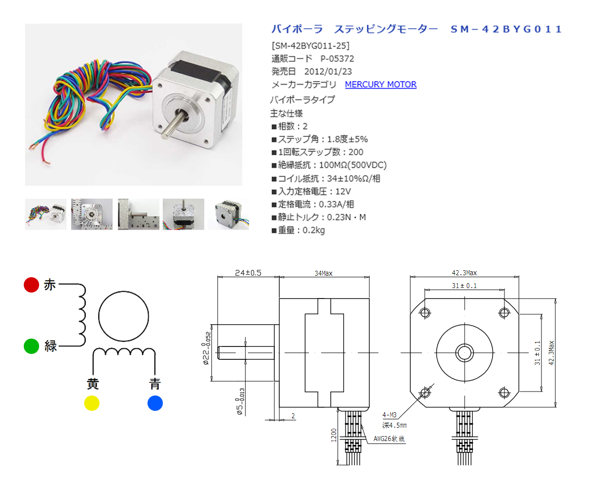- SM-42BYG011(12V)1,380円 → 静止トルク:2.3kgf・cm