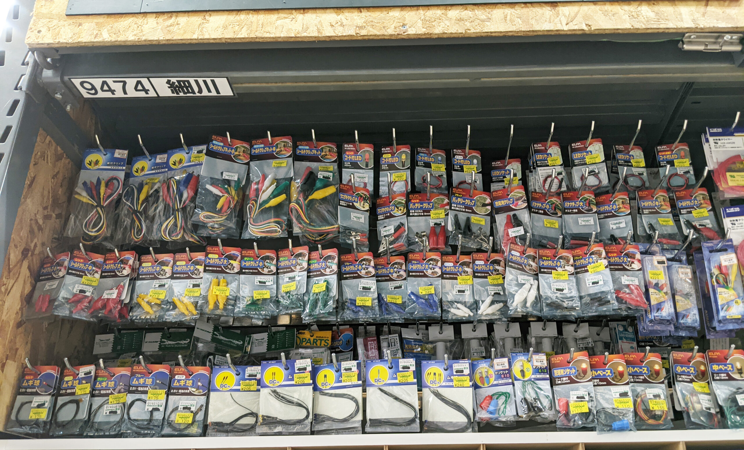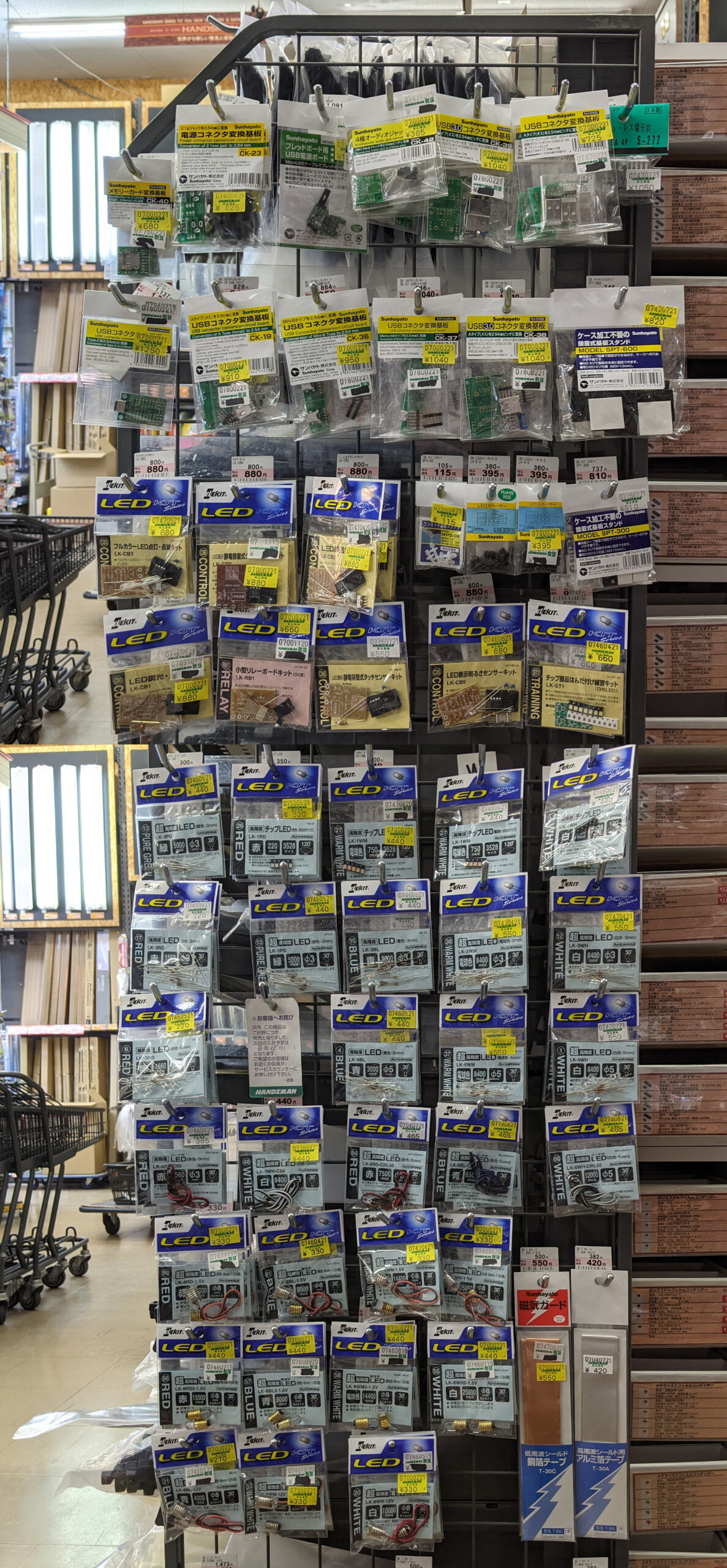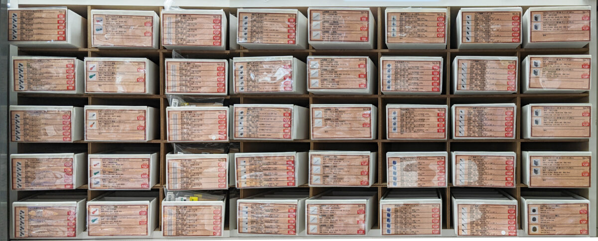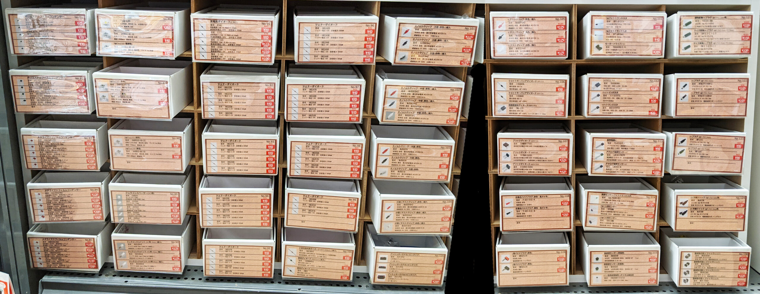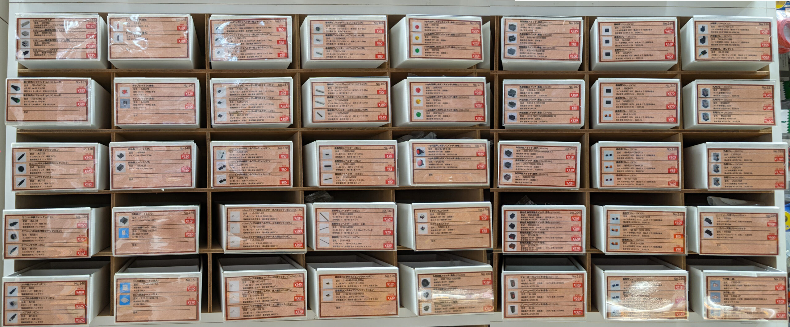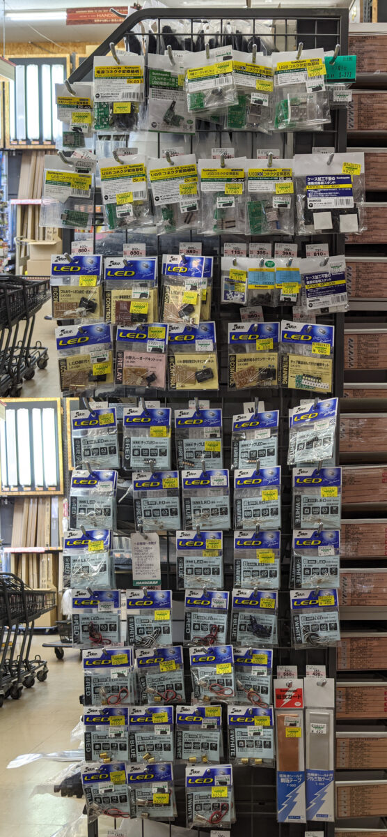 ハンズマン(宮崎市新名爪店)で販売されている電子部品棚の写真を撮ってきました。