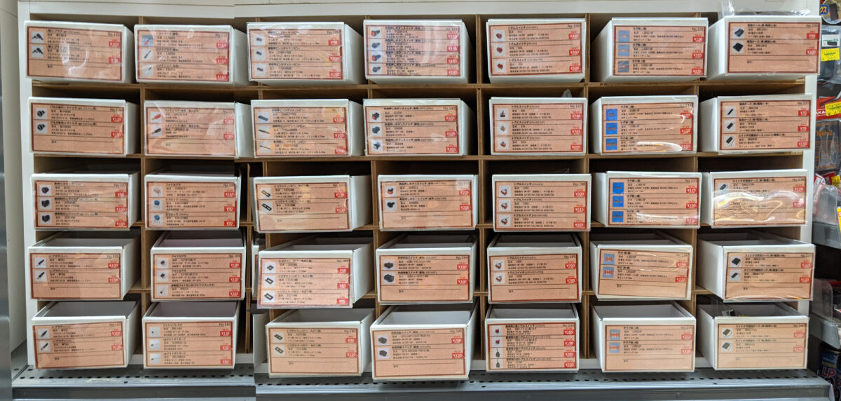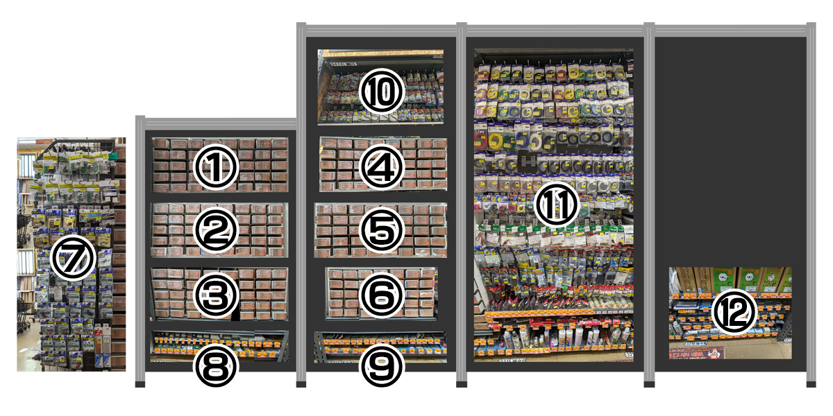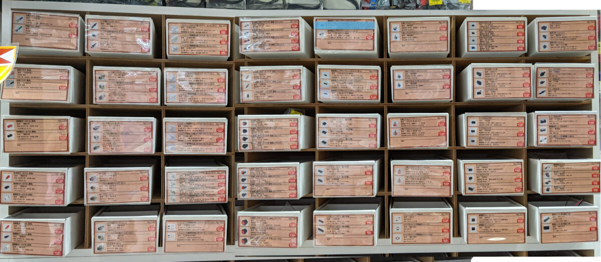 ※これより下に掲載している個別の棚の画像は、クリックで拡大できます。拡大すれば、なんとか型番までは確認できると思います。