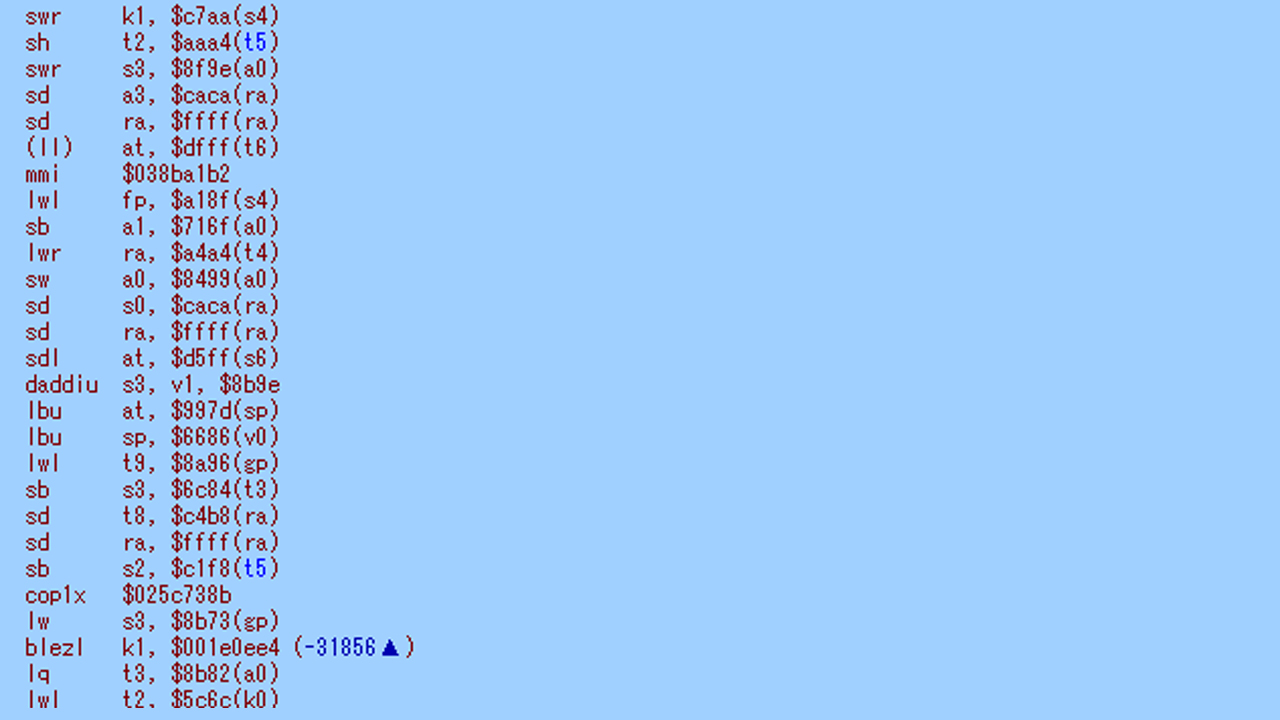 ゲーム内のプログラムを書き換えるには、まず逆アセンブルという作業を行い、バイナリデータで書かれた機械語から、人間が解読できるアセンブリ言語に変換します。