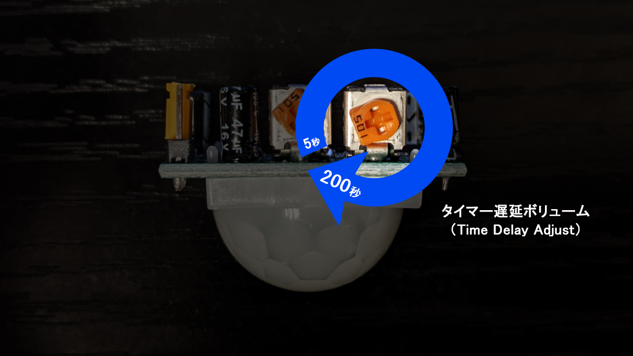 センサーについている『タイマー遅延ボリューム(Time Delay Adjust)』を調整します。