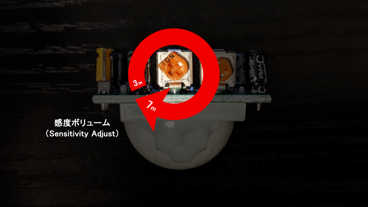 検知距離は『感度ボリューム(Sensitivity Adjust)』で調整することができます。