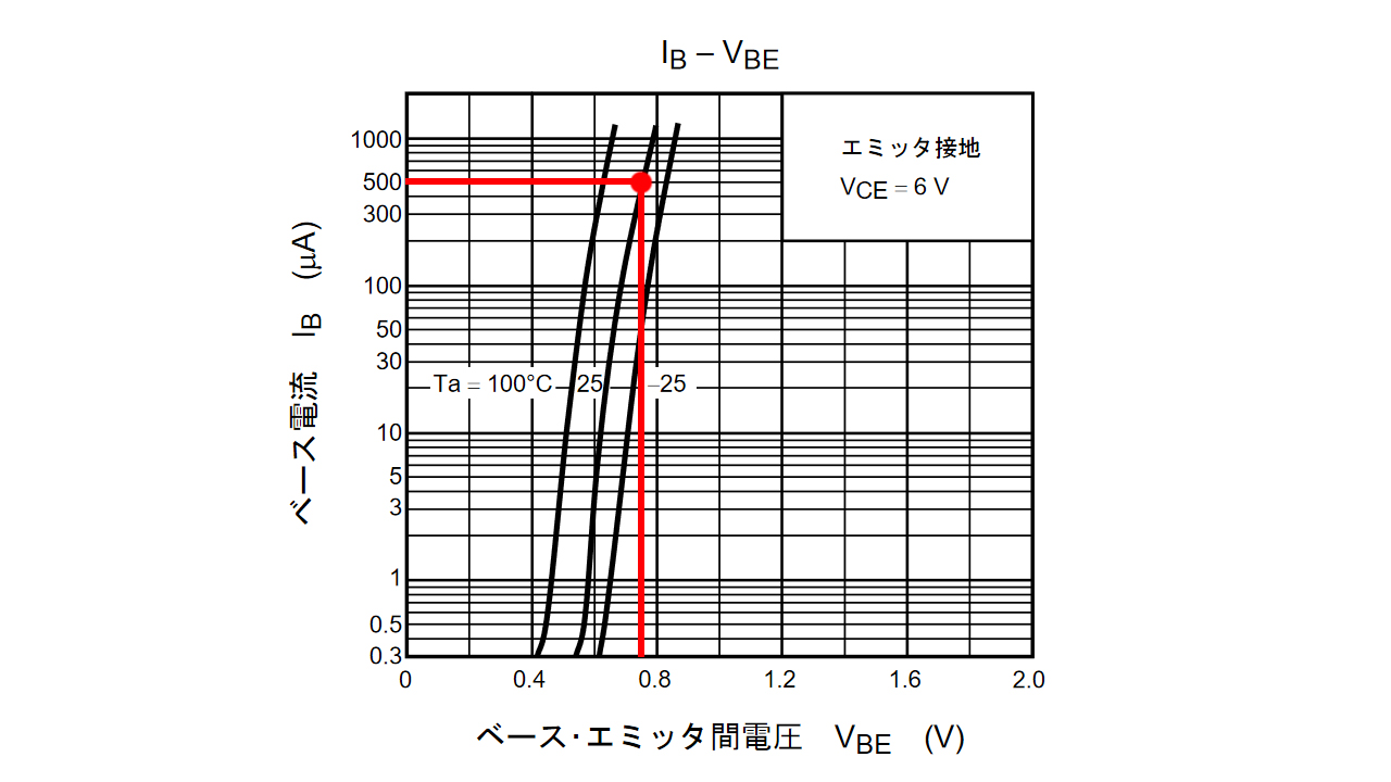 - 2SC1815のベース・エミッタ間電圧:約0.75V(※ベース電流が0.5mAのとき↓)