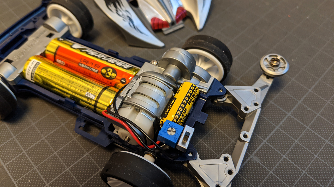 スイッチは、ミニ四駆に元々あるものとは別にもう一つ追加しています。