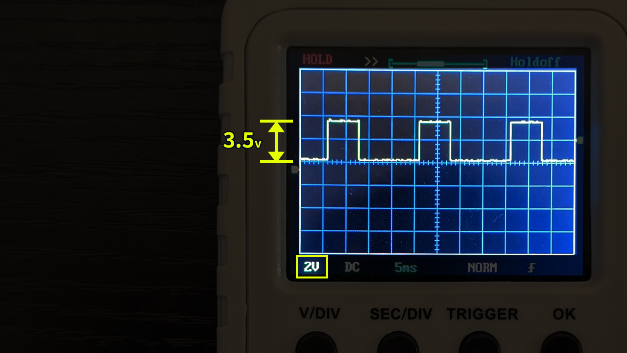 | 波形が大きすぎて画面内に入り切れてない | 1.[V/DIVボタン]を押す → 画面左下の電圧表示に水色の枠線が表示される 2.[ADJダイヤル]を左に回す → 1目盛りあたりの電圧値が大きくなる |