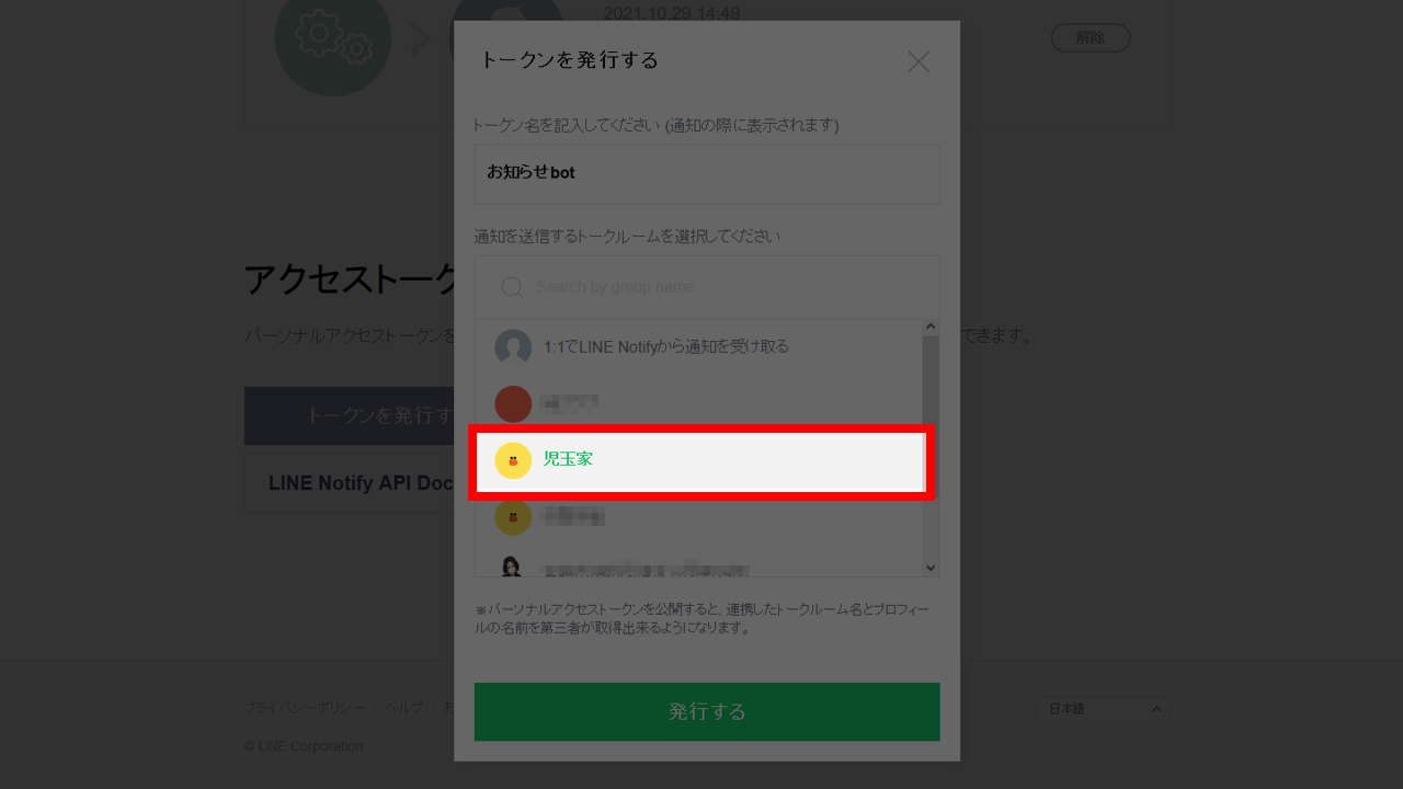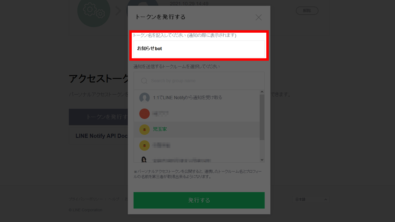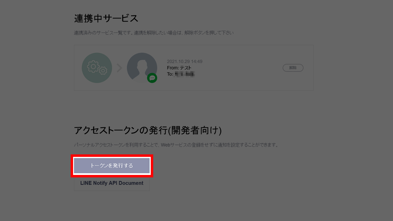 アクセストークンの発行(開発者向け)の文字の下にある[トークンを発行する]ボタンをクリック↓