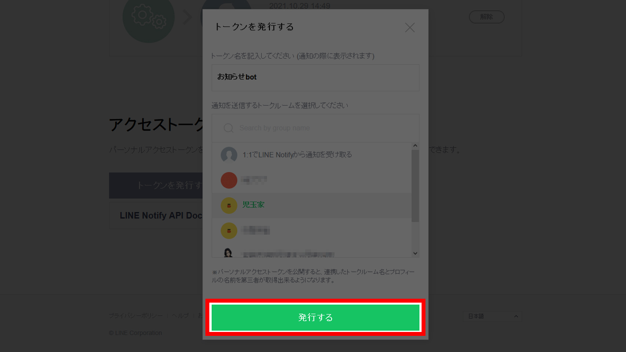 あくまでLINE Notifyを利用するための手続きですので、個人のLINE情報に関わることはありません。