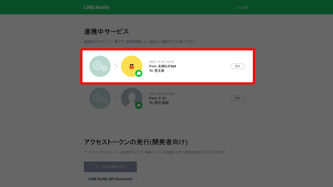[閉じる]ボタンを押すと、連携中サービスのところに、にさきほど追加したトークン名が表示されていることを確認してください↓