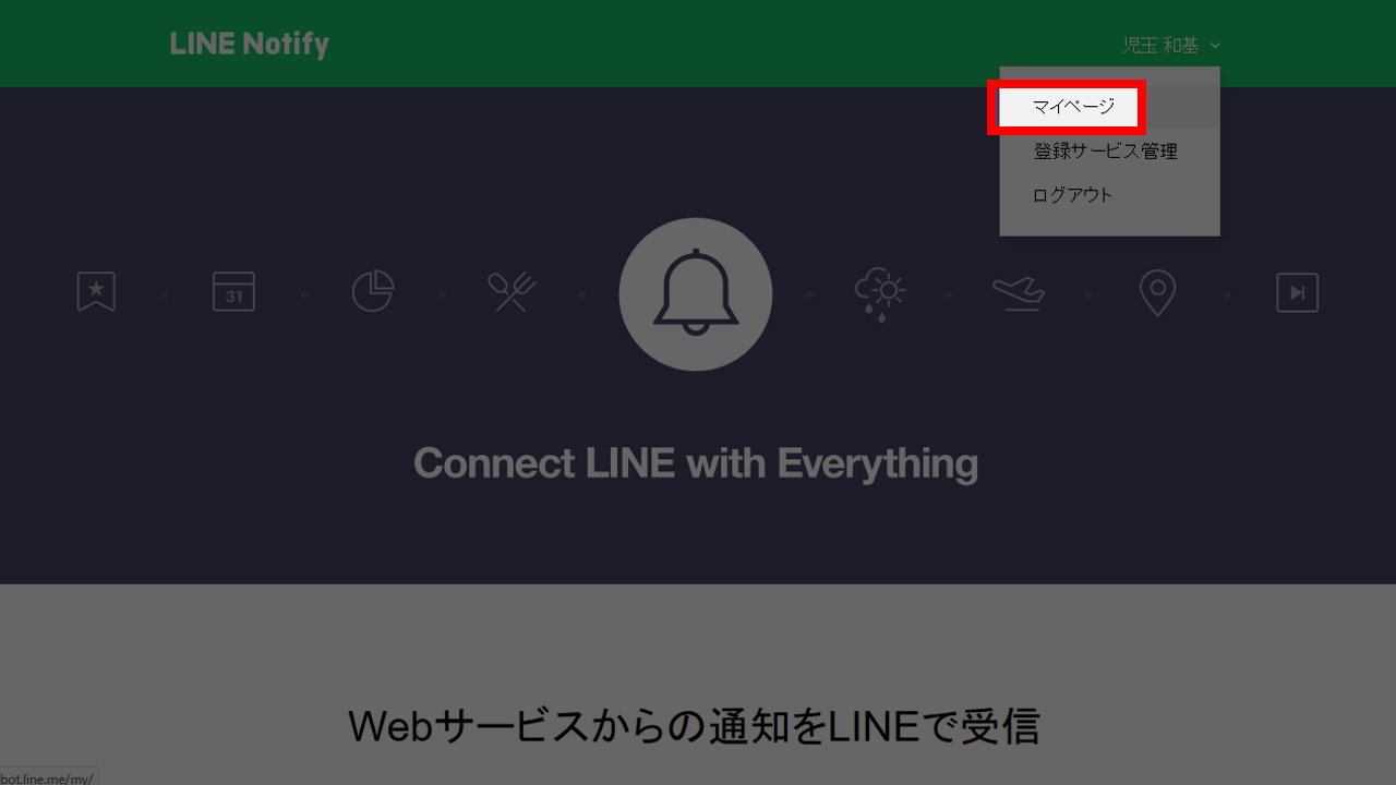 無事にログインできたら、画面右上にLINEに登録した自分の名前が表示されます。