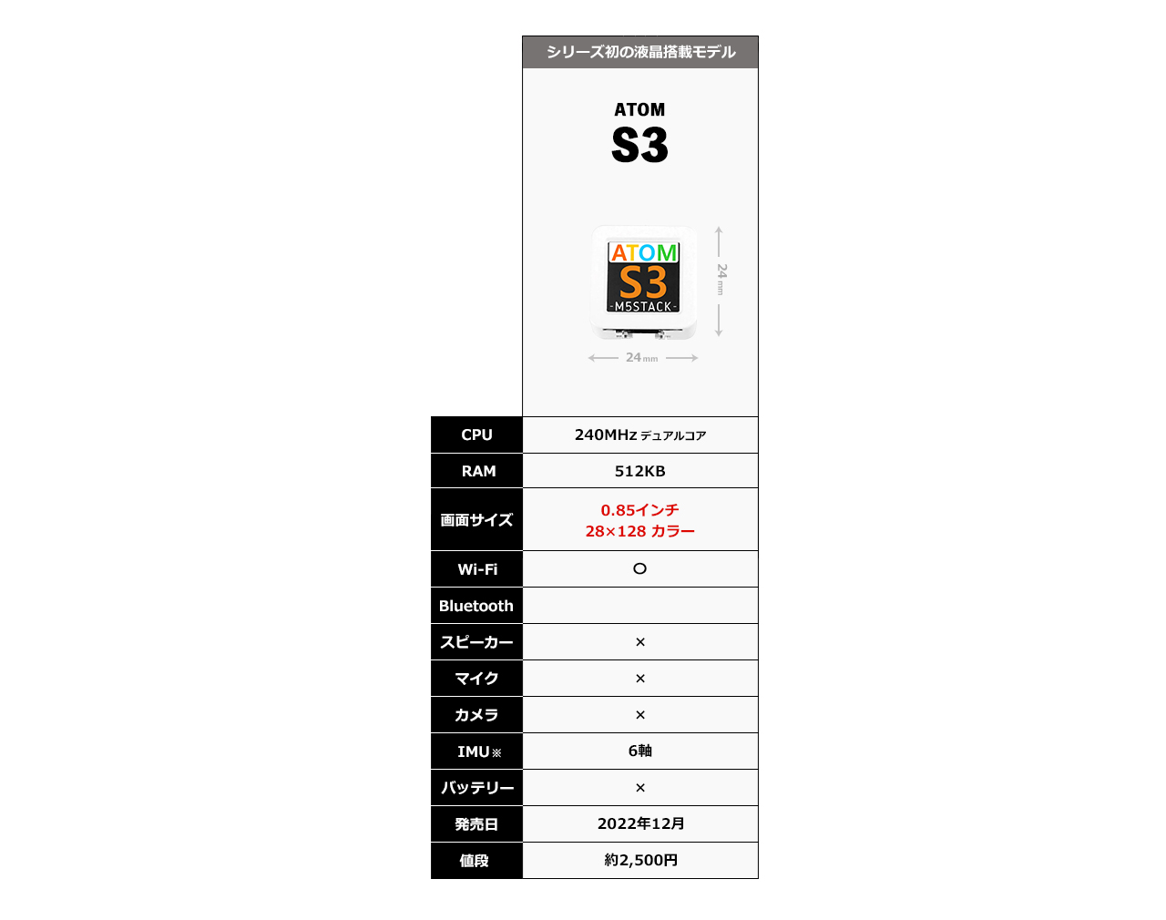 - ATOM S3 ・・・ コンパクトなATOMシリーズに液晶が搭載されたモデル(スイッチサイエンス)