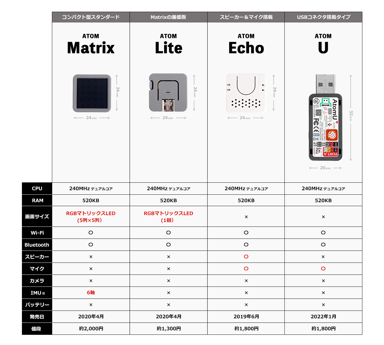 - ATOM Matrix ・・・液晶・バッテリー非搭載の小型モデル。LEDマトリックスを使って、ドットで文字や数値を表現する(Amazon)