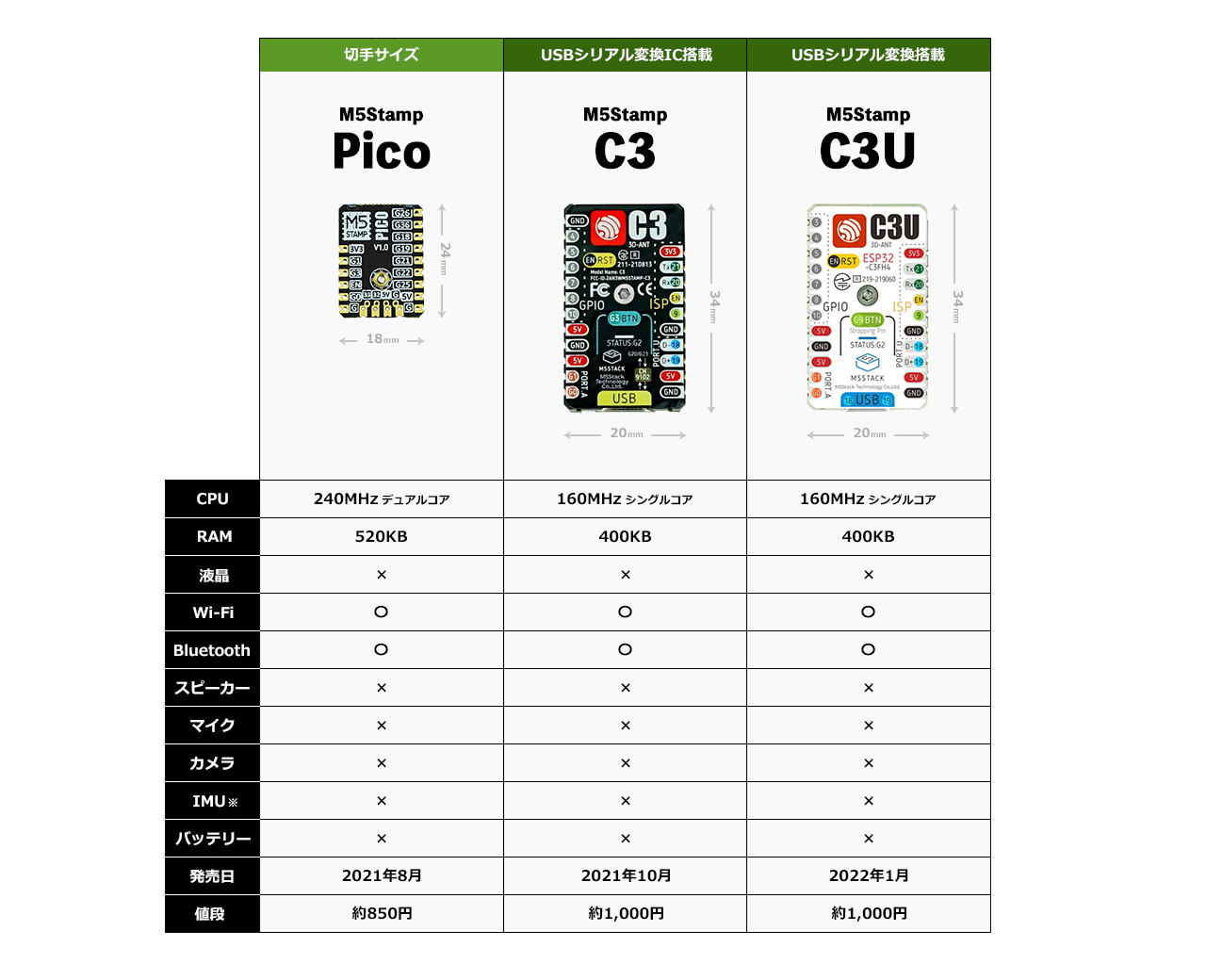 - M5Stamp C3 ・・・ M5Stamp PicoにUSBシリアル変換ICを搭載したモデル(スイッチサイエンス)