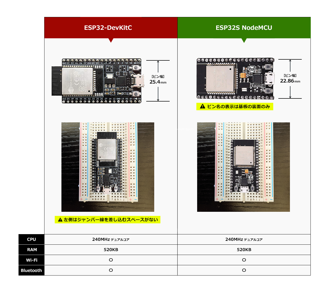 部品の配置場所やボードの大きさなどの細かい違いはありますが、同じESP32チップを使っているので、性能は同じです。