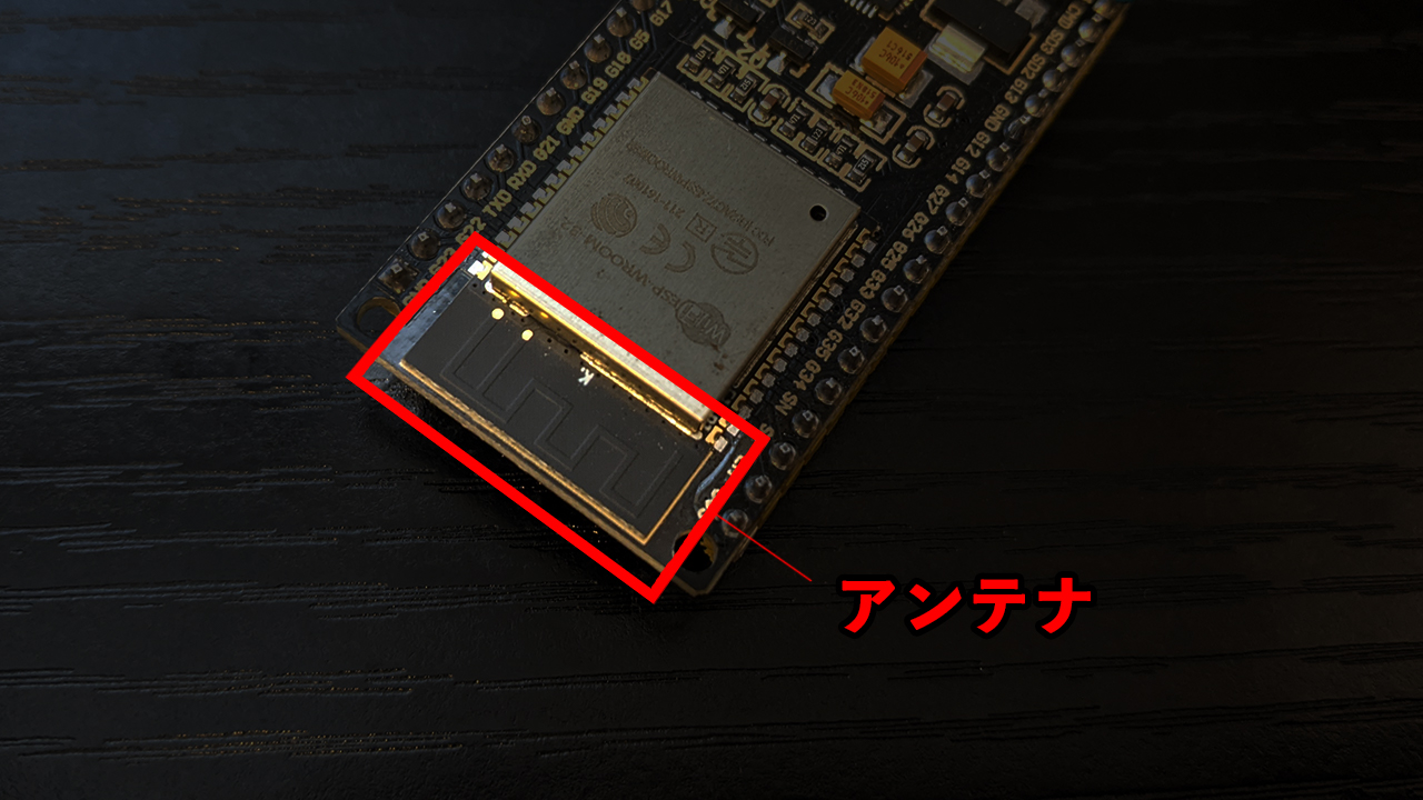 一般的なESP32には、Wi-FiやBluetoothの電波を受信するアンテナが搭載されています。