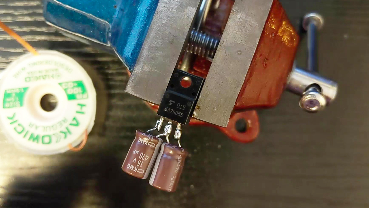 なお、三端子レギュレーター用の入力端子・出力端子それぞれに、電解コンデンサ(470μF/16V)を入れています。