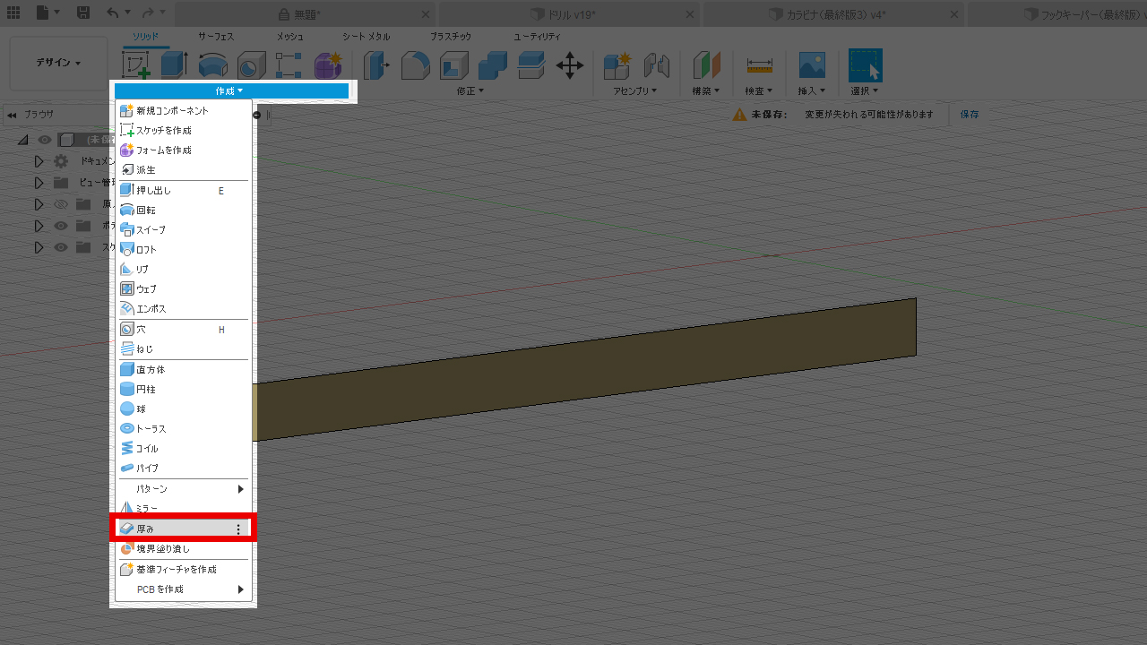 ちなみに[押し出し]を行うと、デザイン画面に移動するので、画面上の[作成]ー[厚み]で立体的な形を作成することができます。