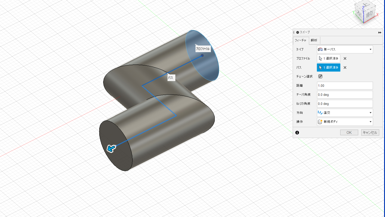 [スイープ]コマンドを選択し、プロファイル(断面)とパスを選択するだけです。