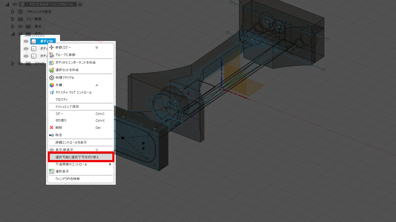 画面左のボディ名を右クリックすると、[選択可能と選択不可を切り替え]という項目があります。