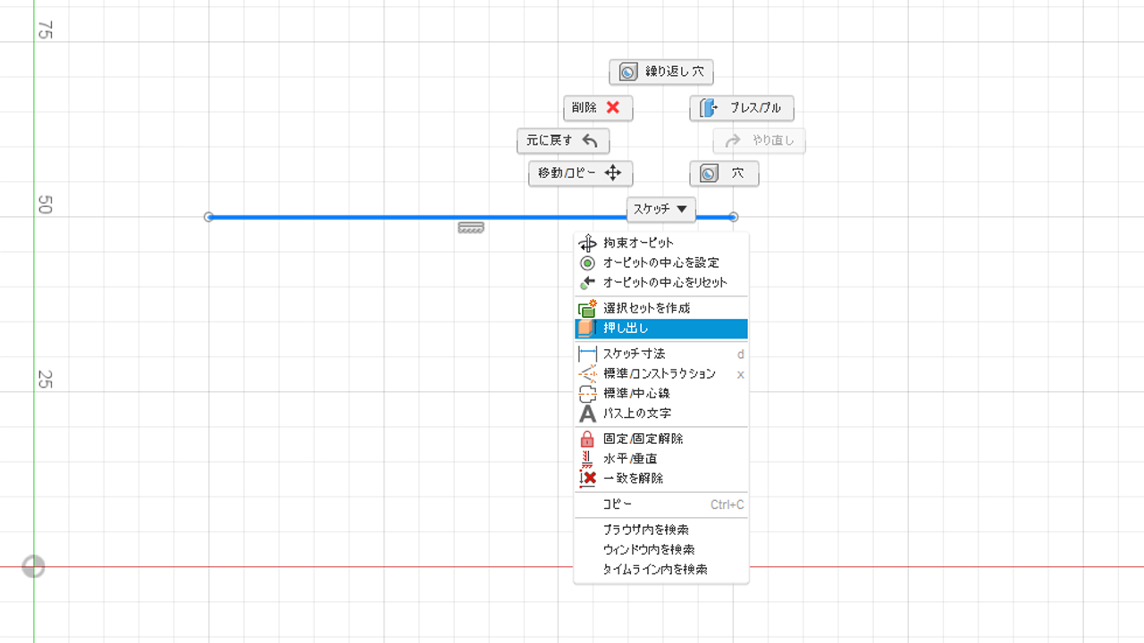 円や四角形で描いたスケッチと違い、線分はデザイン画面の[押し出し]で選択することができません。