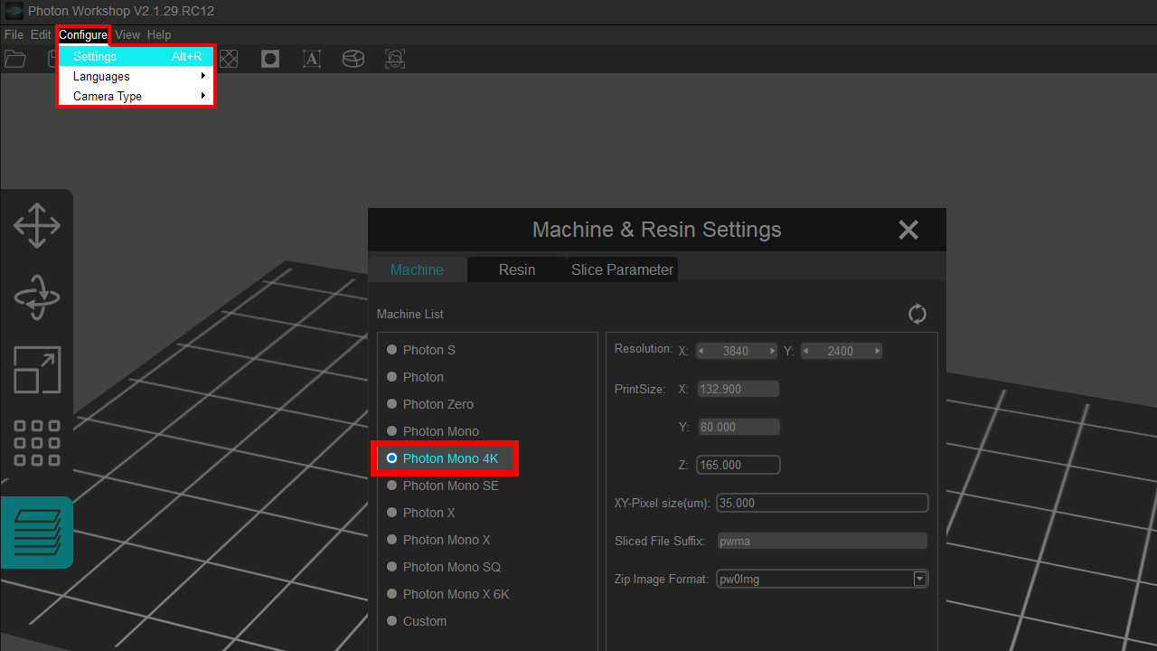 使用する3Dプリンタを選ぶ画面が表示されるので、「Photon Mono 4K」を選択し、[Save]ボタンを押して下さい。