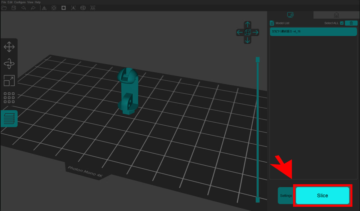 次に、3Dデータ(.stl/.obj)を開き、画面右下の[Slice]ボタンを押して、「.pwma」形式でUSBメモリに保存してください。
