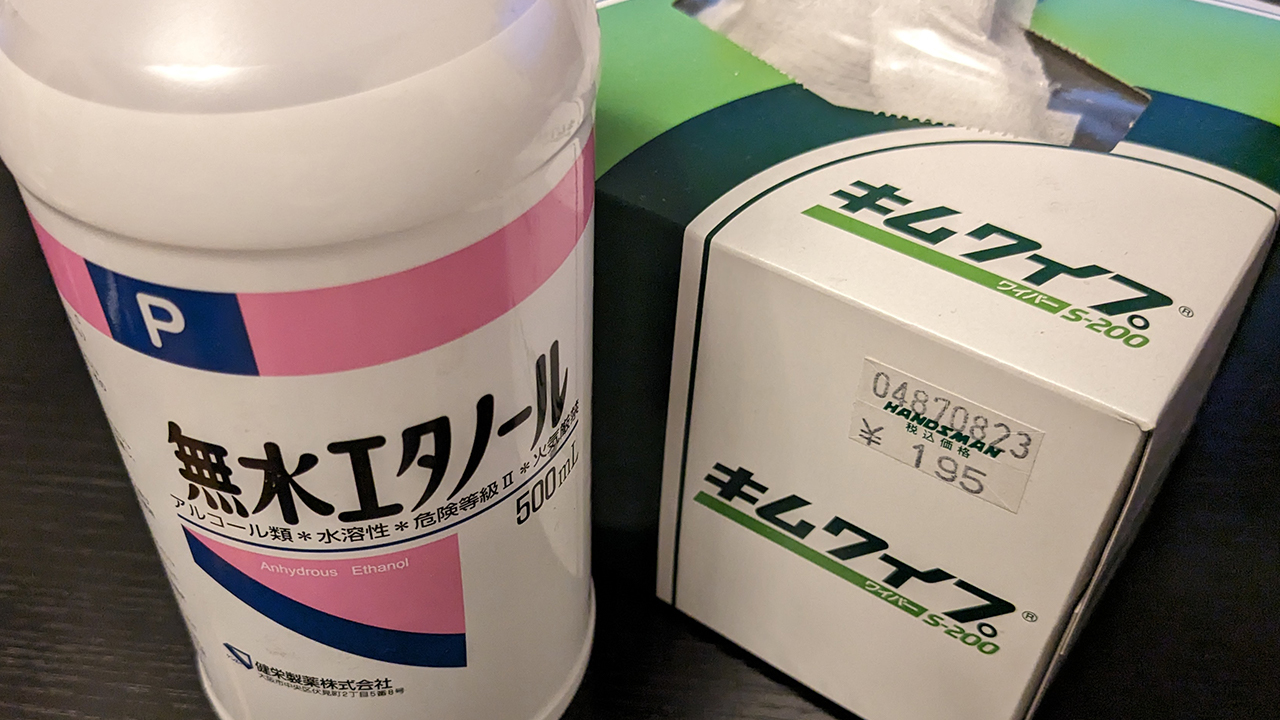 掃除の際には、無水エタノール(毒性のないアルコール)とキムワイプ(吸収性の良い紙ウエス)は必需品ですので、あらかじめ準備しておきましょう。