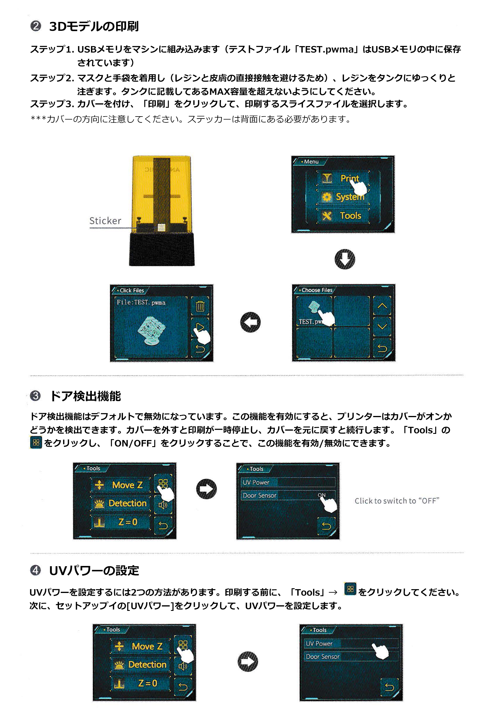 Page3:3Dモデルの印刷/ドア検出機能/UVパワーの設定