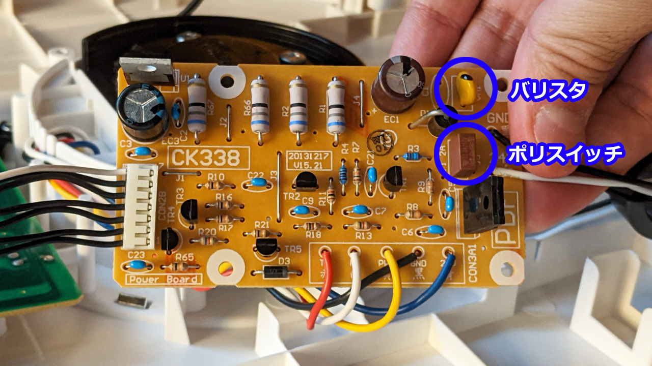 電源が入らなくなるような作業はしていないので、おそらく、なにかしら過電流・過電圧が流れて、ポリスイッチ(温度ヒューズ)・バリスタが作動したのだと思います。