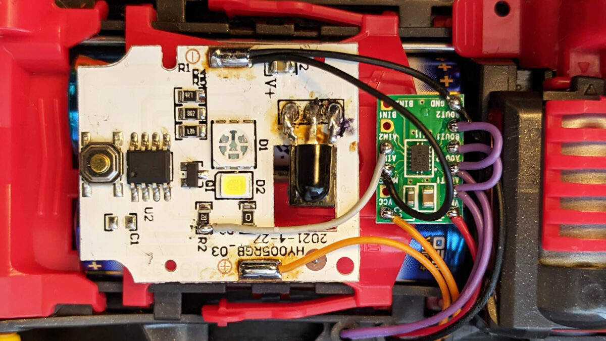 電池カバーの上にモータードライバー基板とセンサーライト基板を両面テープで貼り付け、ケーブルをはんだづけします。
