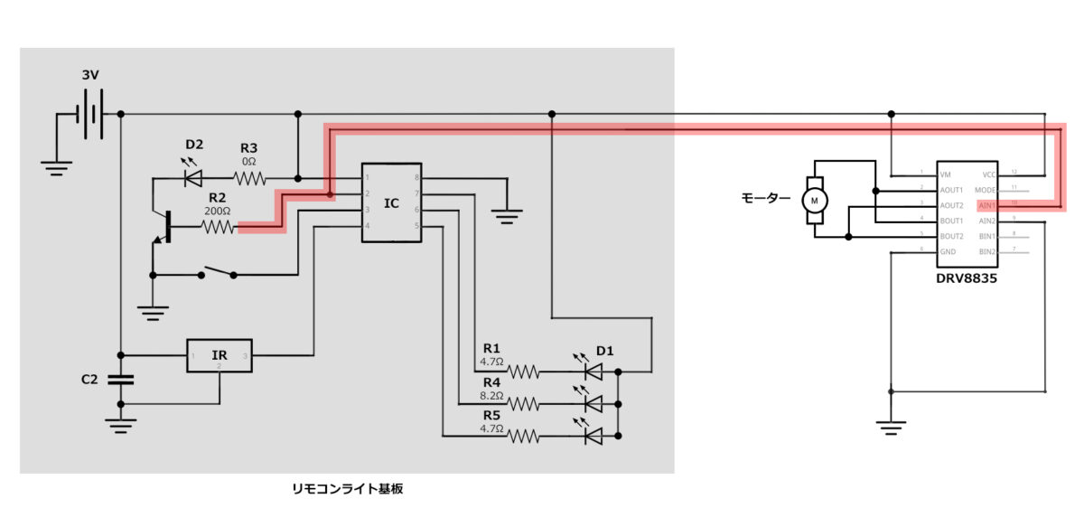※プチ電車は電池1個(1.5V)で駆動していたので、リモコンライト基板を動かすための電圧を確保するために色々な部品が必要でした。