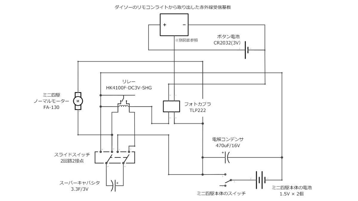 今回の改造は、リモコンのボタンが押されると、電池にスーパーキャパシタを直列に接続する回路に切替。