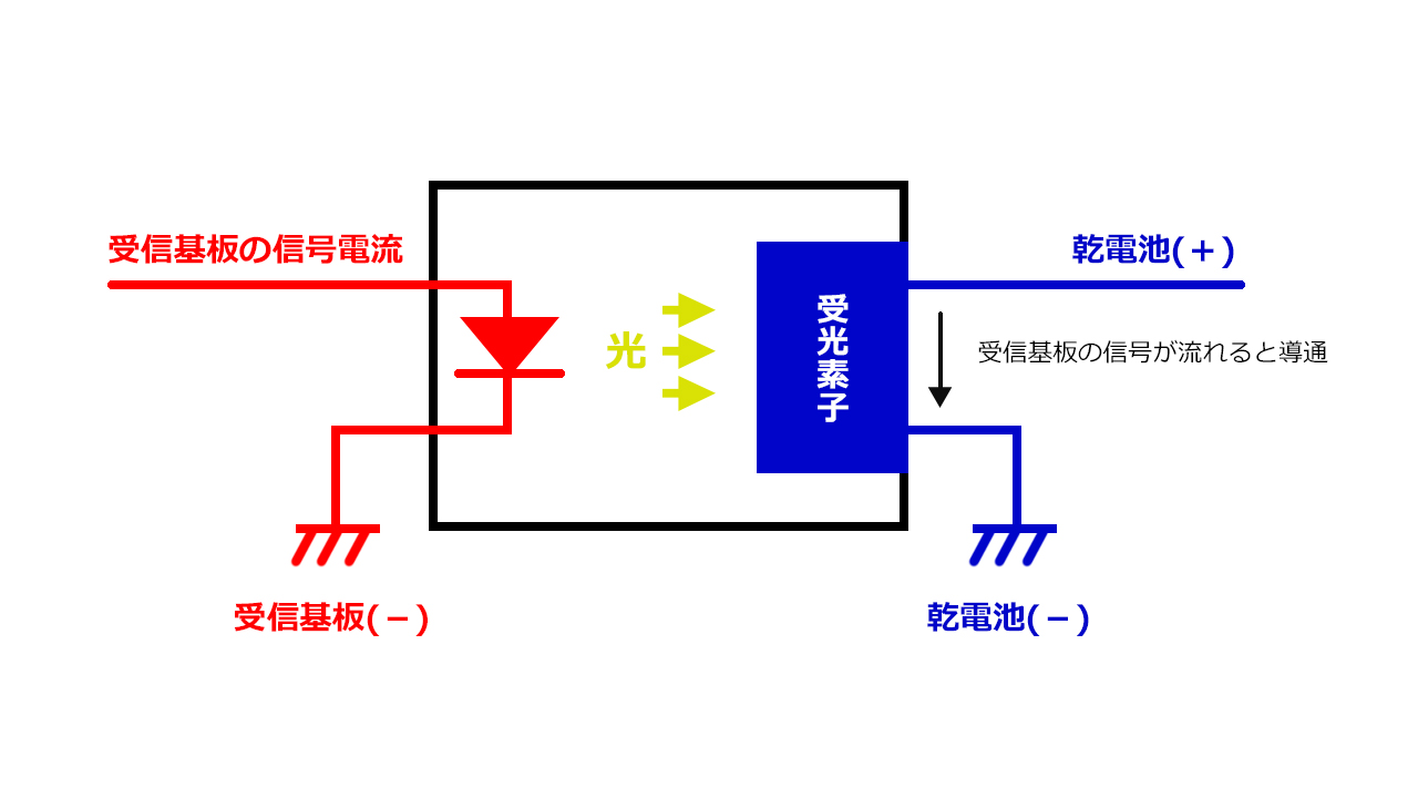 フォトカプラを使えば、リモコンライトの小さい電流信号を起点にして、乾電池から電源から大きい電流を引っ張ってくることができます。