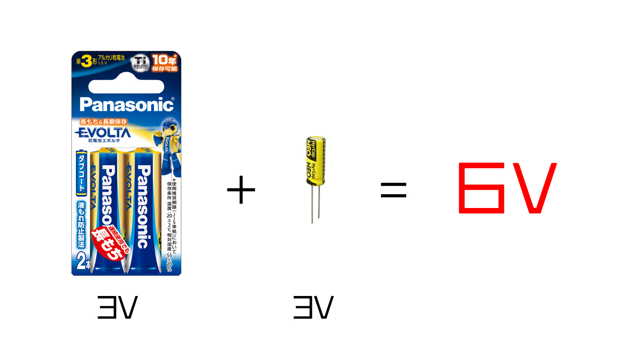 このとき、単三電池と直列接続する回路になるので、モーターに掛かる電圧は一時的に3Vから6Vにアップします。