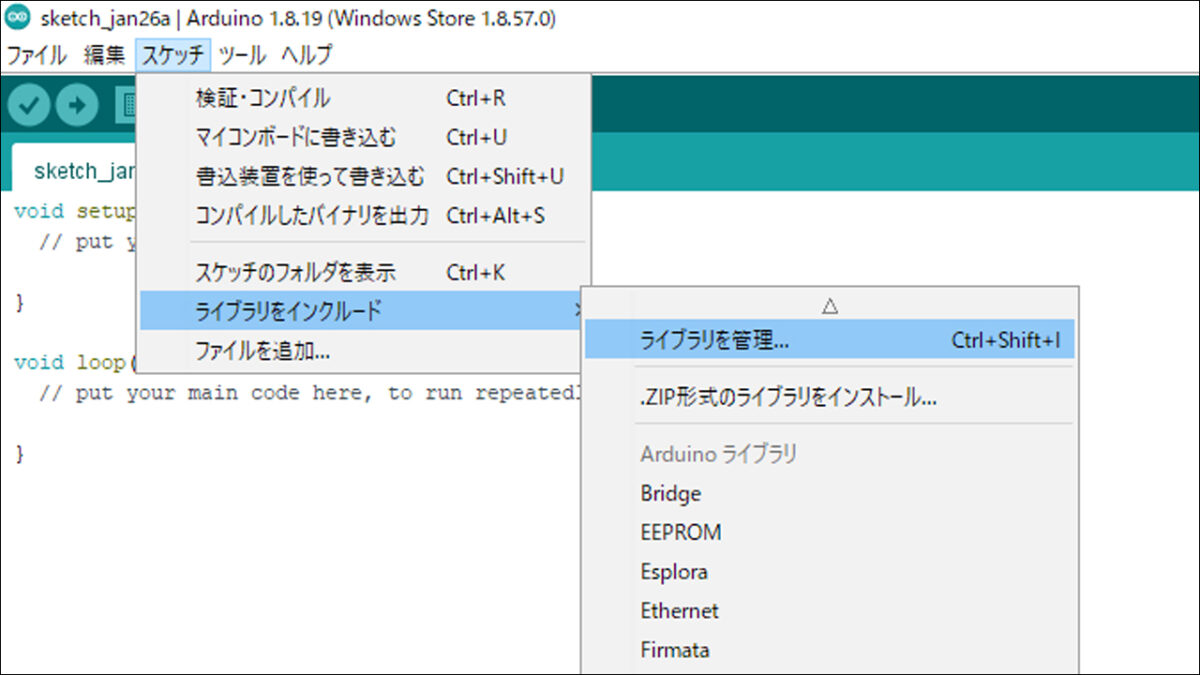 1.Arduino IDEを起動し、上部メニューの[スケッチ]-[ライブラリをインクルード]-[ライブラリを管理]をクリックする。