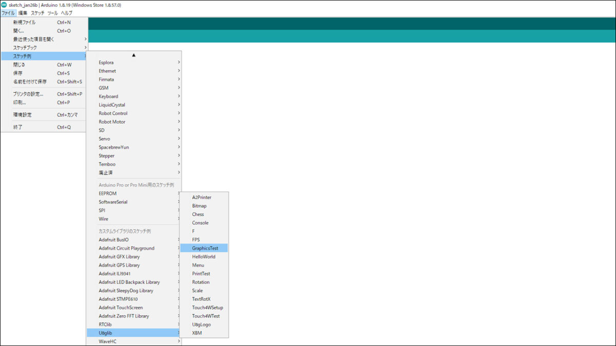 1.画面上部の[ファイル]-[スケッチ例]-[U8glib」-[GraphicsTest]をクリックする。