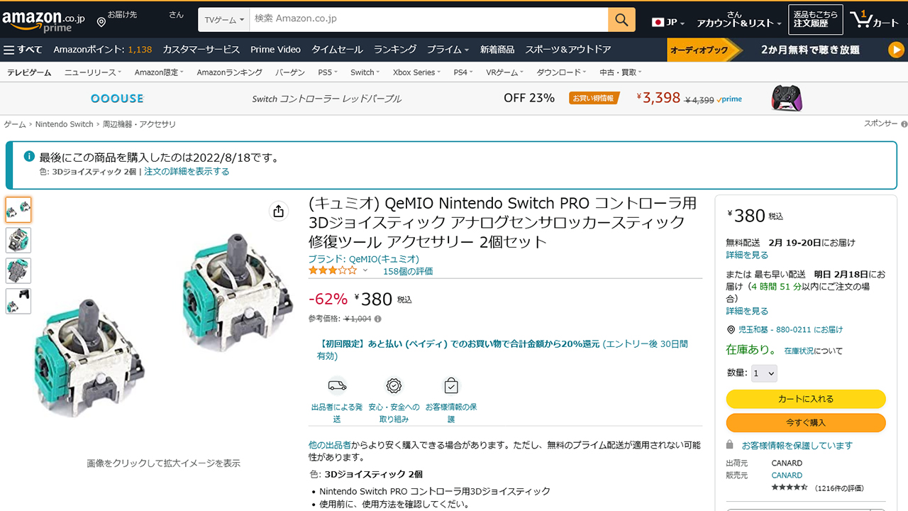 ちなみに半年前、同様のドリフト問題を発症してジョイスティックを丸ごと交換した右スティックは、現在も快適に使えています。