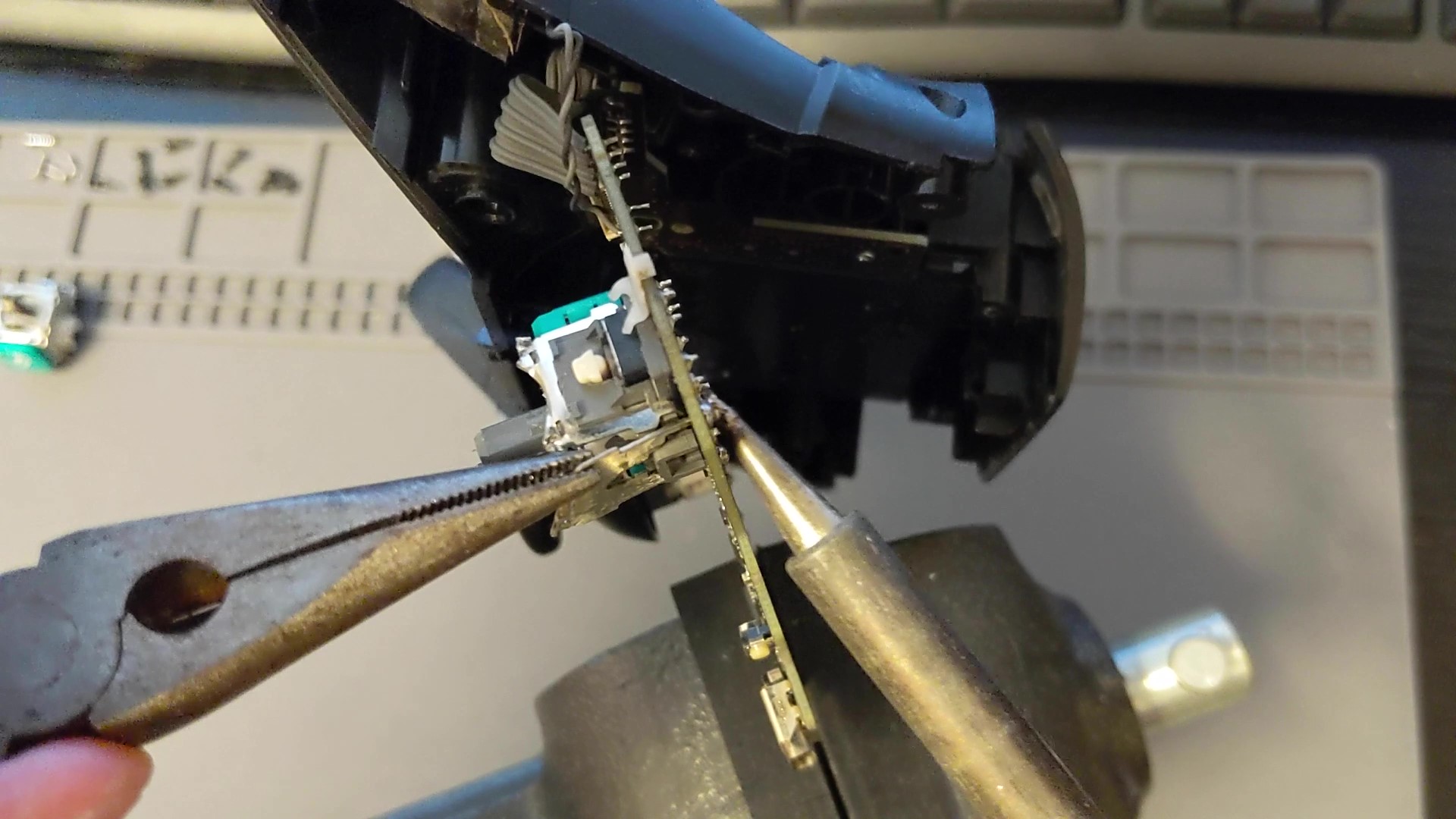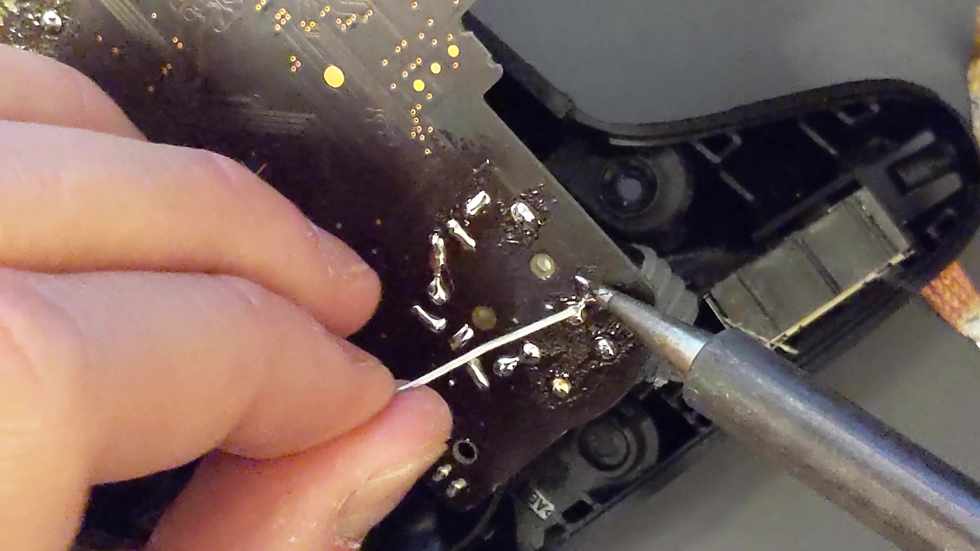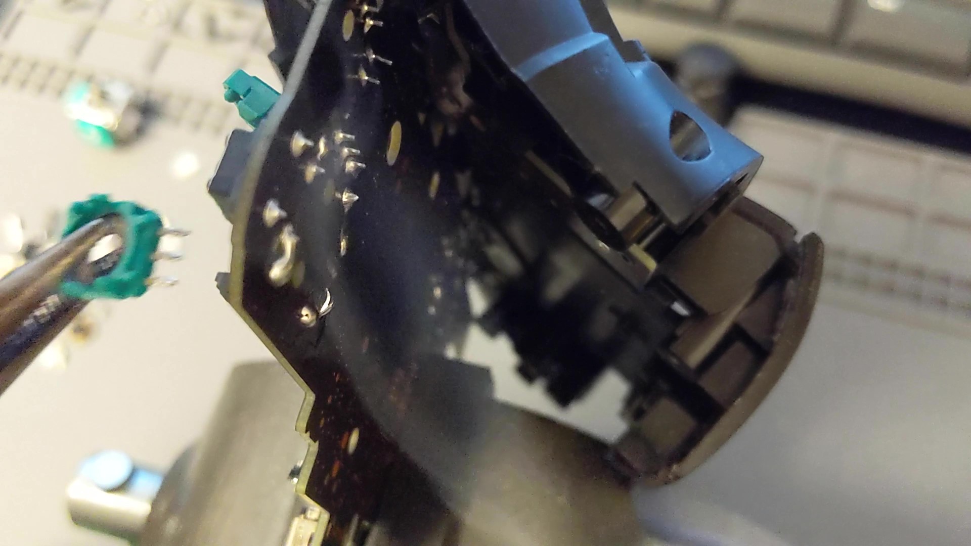 はんだごて一本ではピン全てを同時に温めることはできないので、ジョイスティックを壊して、ピンを4分割させています。