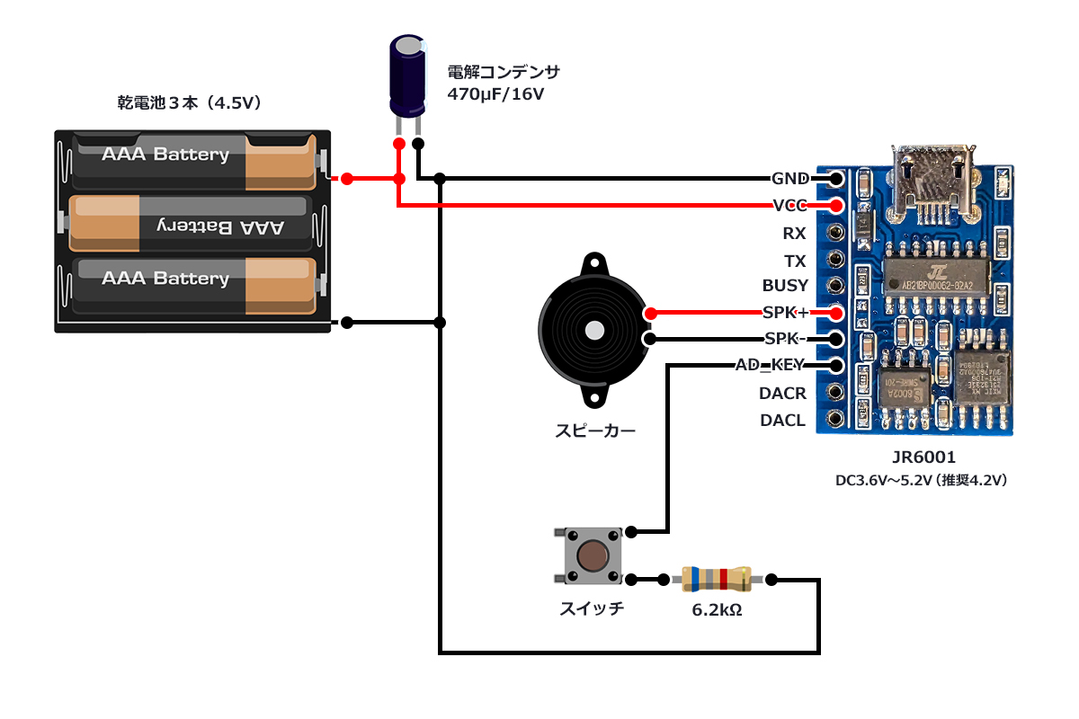 上記の配線図のようにJR6001単体でスイッチを使って音を再生させる場合は、音が小さいので、下記のようなサイトであらかじめ音量をアップさせておく必要がありそうです↓