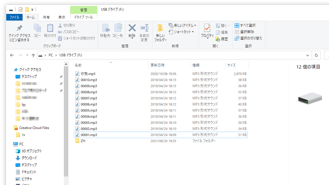 パソコンとJR6001(USB Micro-B)を接続すると、フラッシュメモリにアクセスできるので、その中に音声データを保存するだけです。