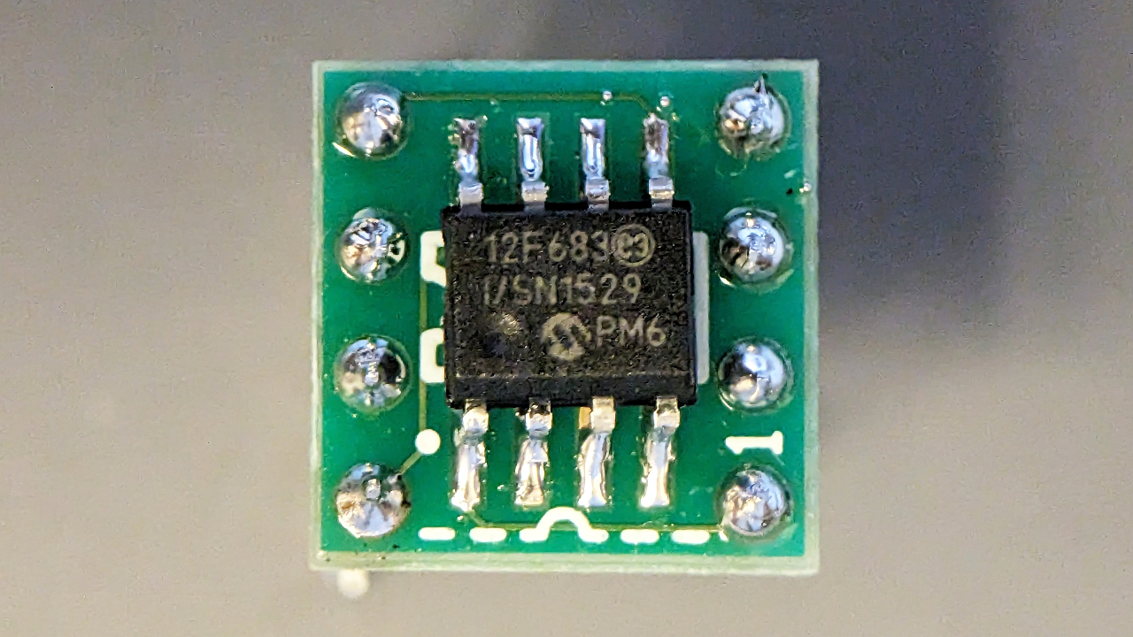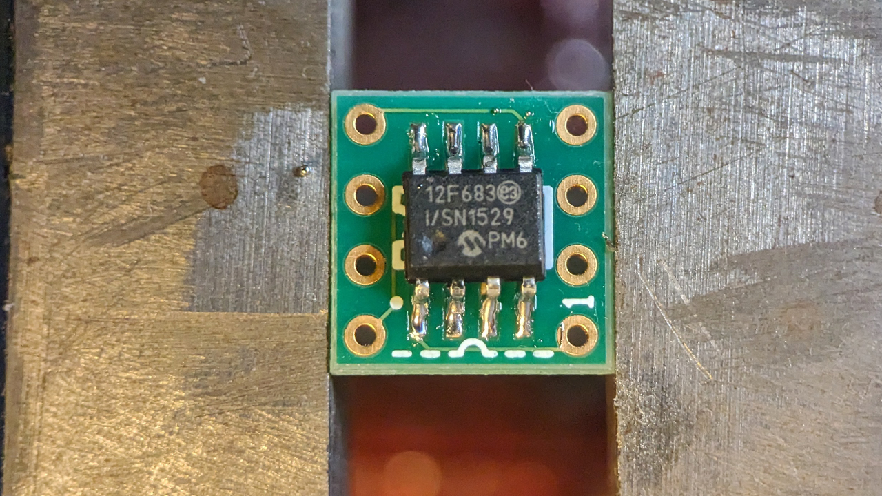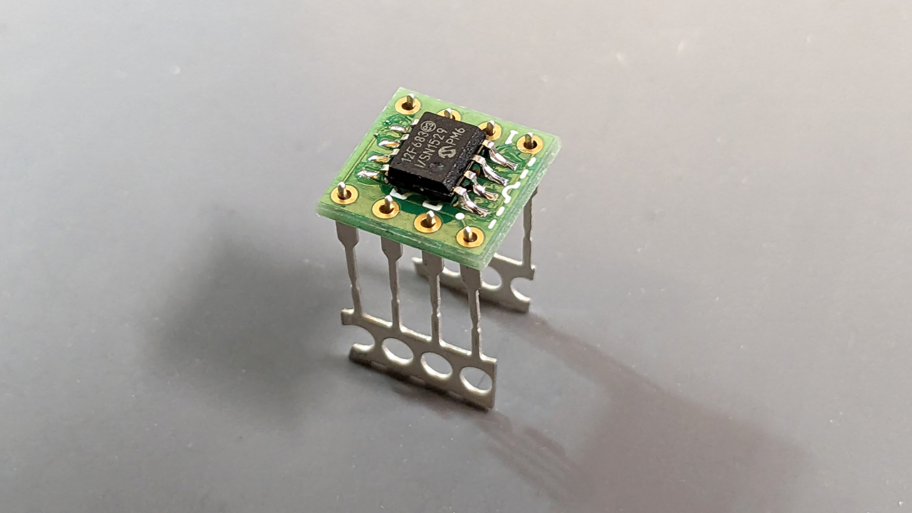 今回は、表面実装タイプのIC(PIC12F683)とそのSOP変換基板にリードフレームを取付けます。