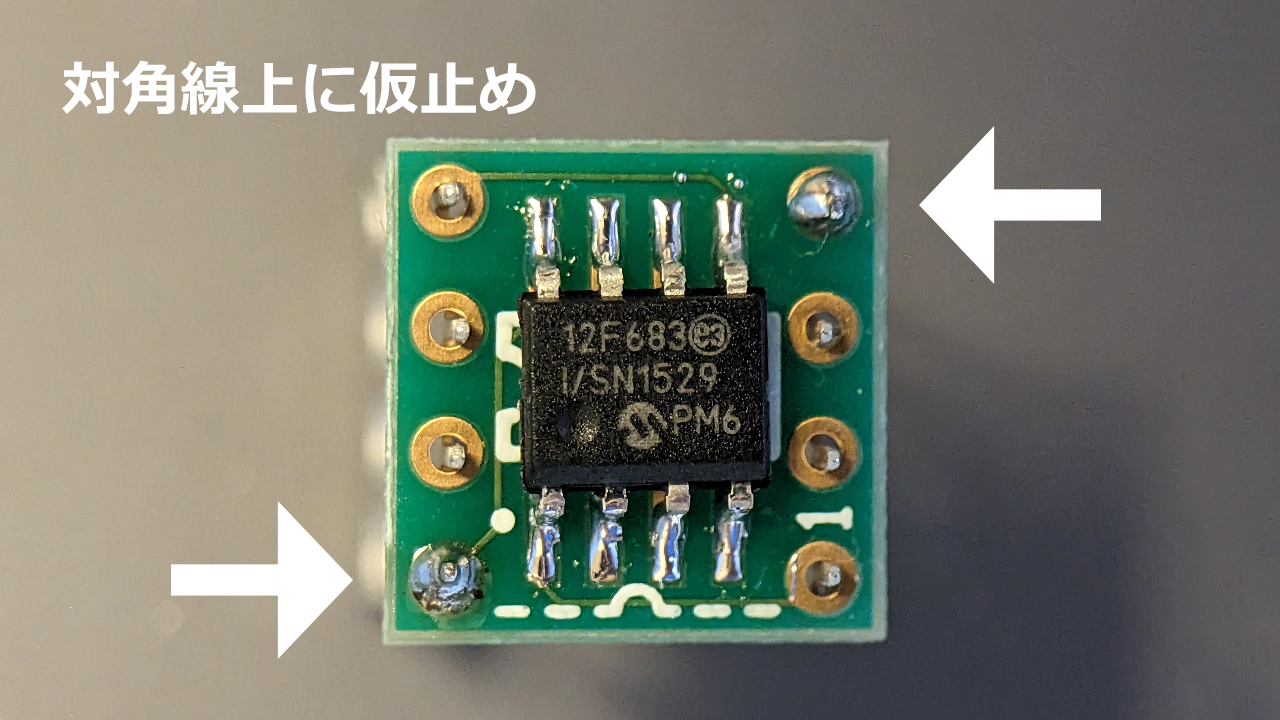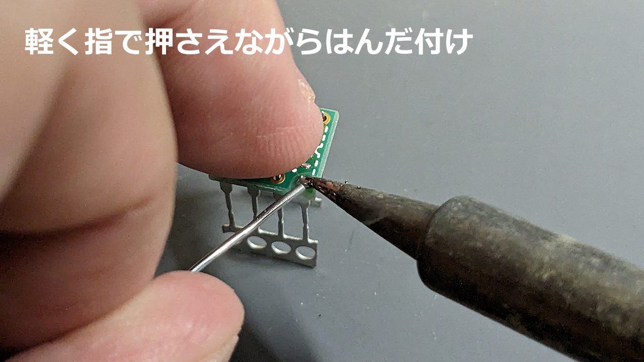 基板とリードフレームを密着させるため、軽く指で下に押さえつけながら、対角線上にはんだ付けします。
